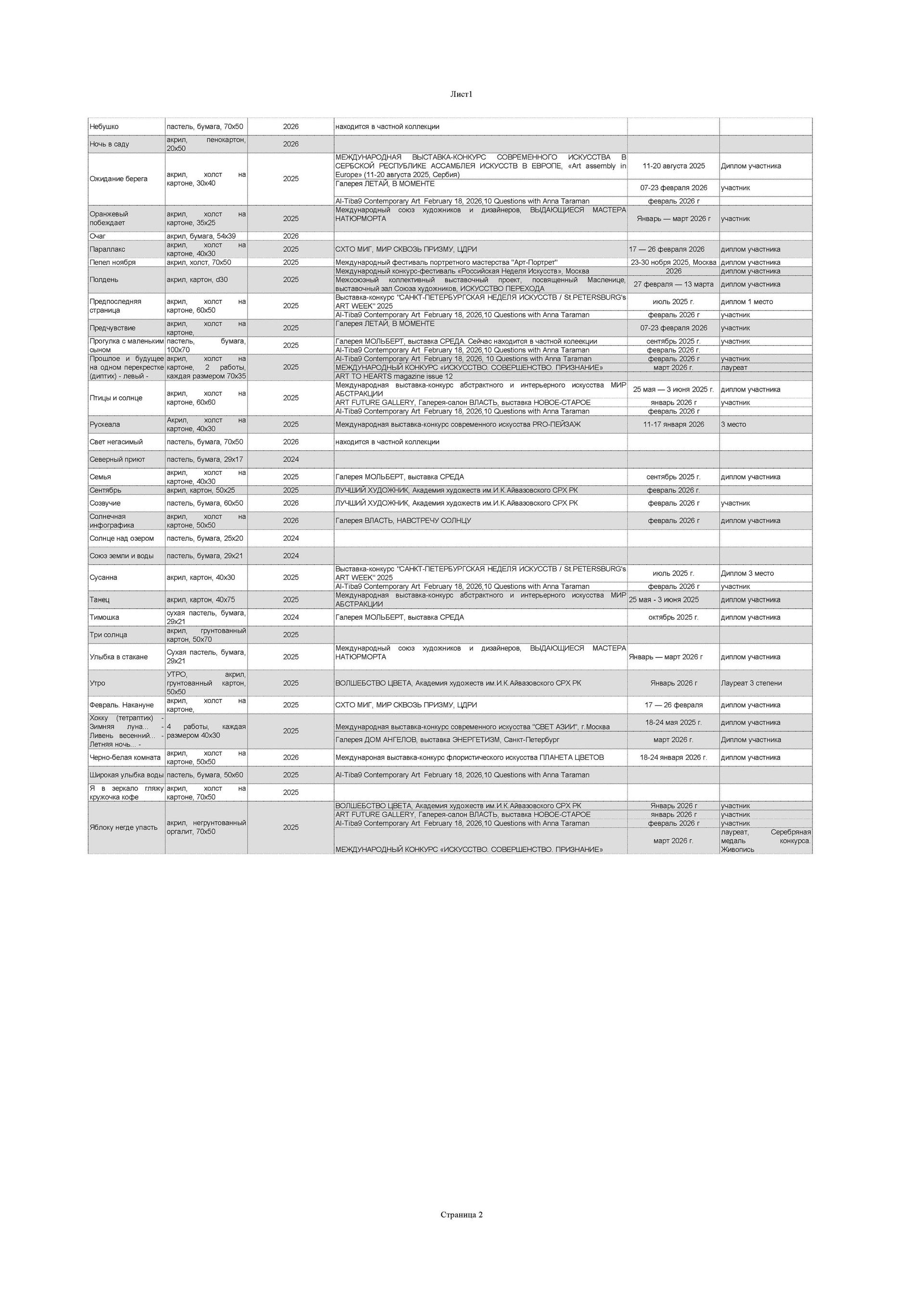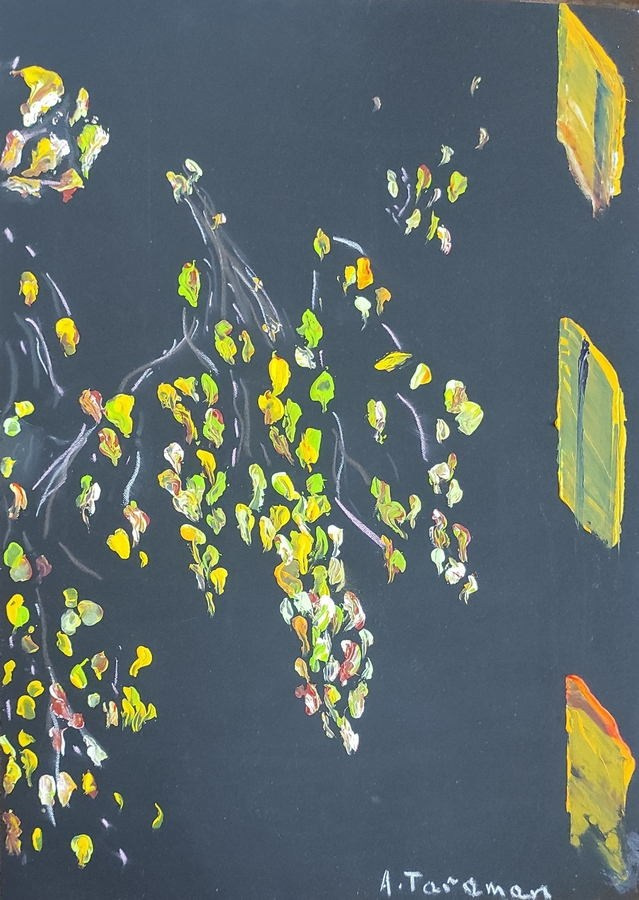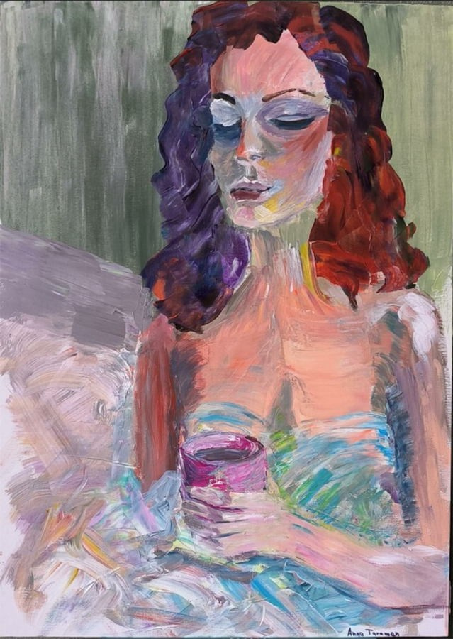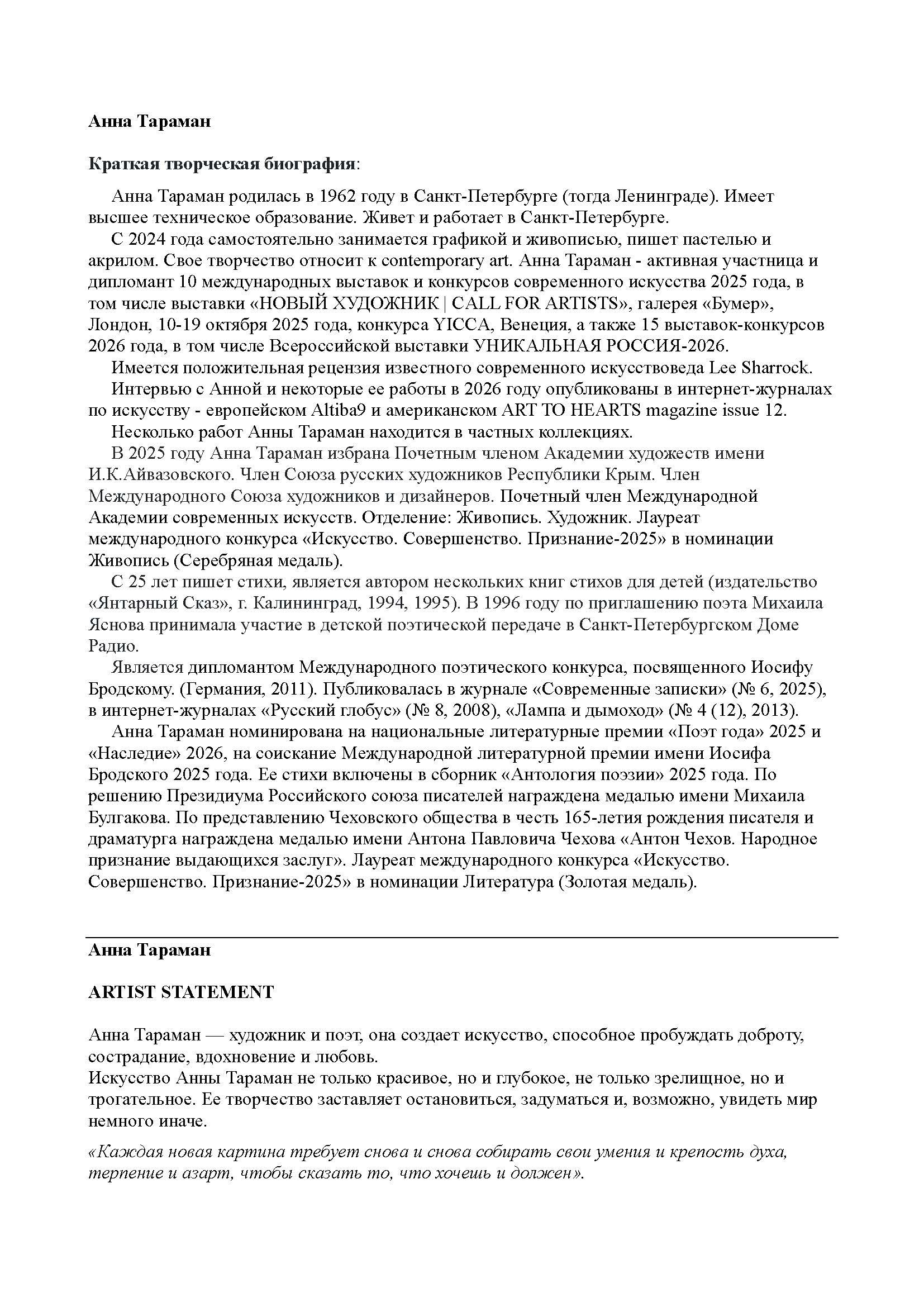 «Художница из Санкт-Петербурга и поэтесса, удостоенная множества наград, Анна Тараман привносит в свое изобразительное искусство редкую лирическую чувствительность. Тараман, пишущая стихи с двадцати пяти лет, наполняет свои картины поэтической меланхолией, которая выходит за рамки простой формы. Ее абстрактное изображение женской фигуры, парящей в пустоте зеленой жидкости („Две полоски“) — сказочном пространстве, напоминающем зефирное облако, — передает состояние между осознанностью и мечтательностью, как бы переводя эмоции в цветовую медитацию. Такие работы, как „Зеленый шум“ и „Атланты“. это чувственность, слияние текстур природы с метафизическими оттенками. Палитра Тараман, основанная на зелени и мягких, рассеянных оттенках, создает ощущение безмятежности и необычности, помещая ее творчество между пейзажем и мечтой. Обратившись к живописи в 2024 году, она использует пастель и акрил с тем же вниманием к ритму и тишине, которые определяют ее стихи. Ее полотна не просто иллюстрируют поэтическую мысль, они мыслят поэтически, приглашая зрителей во внутренний мир, где язык растворяется в цвете, а эмоции находят свое истинное выражение в абстракции».