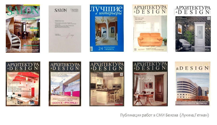 Работы опубликованы в журналах «SALON» 2000 г., «Лучшие Интерьеры» 2005 г., «Архитектура& DESIGN» 2008 г., 2011 г, 2012 г.,