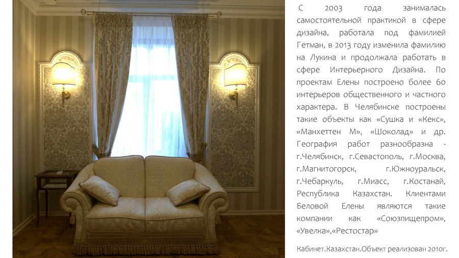 Елена — победитель городских конкурсов в профессиональной среде в области архитектуры и дизайна в номинации «Общественные интерьеры», 2009 г, 2015 г.