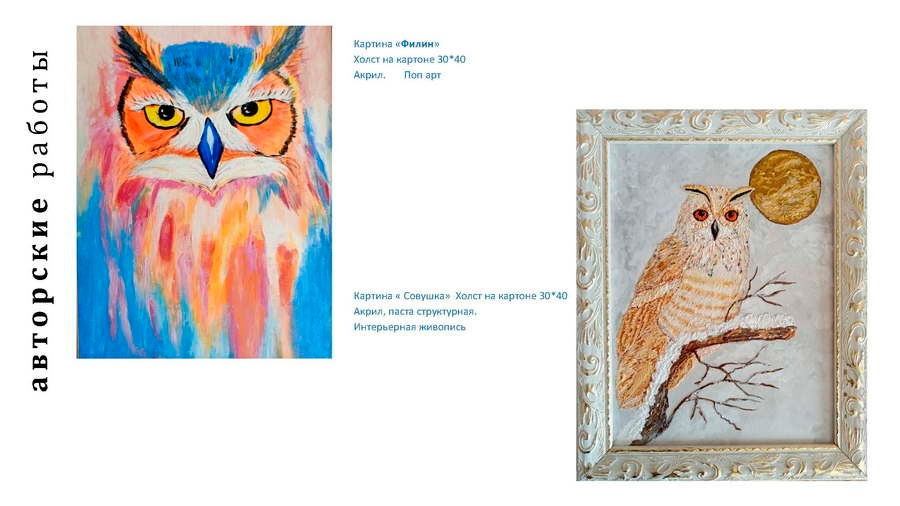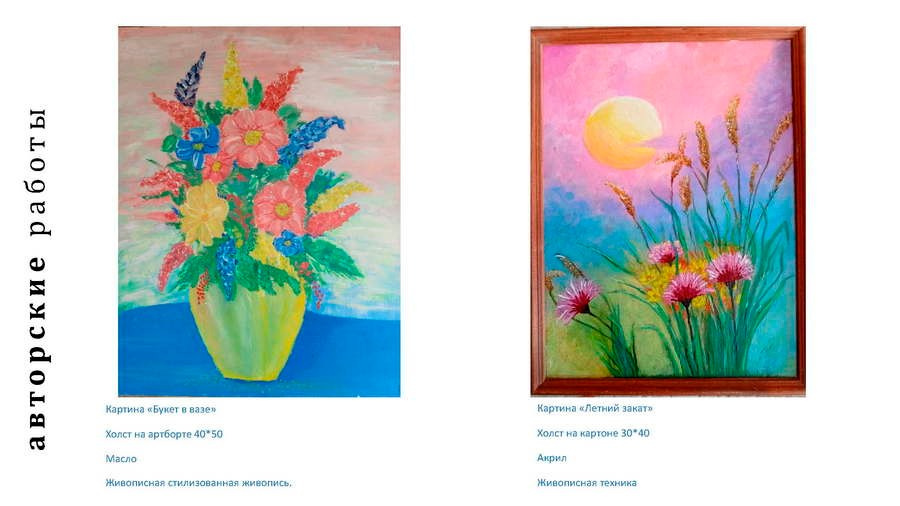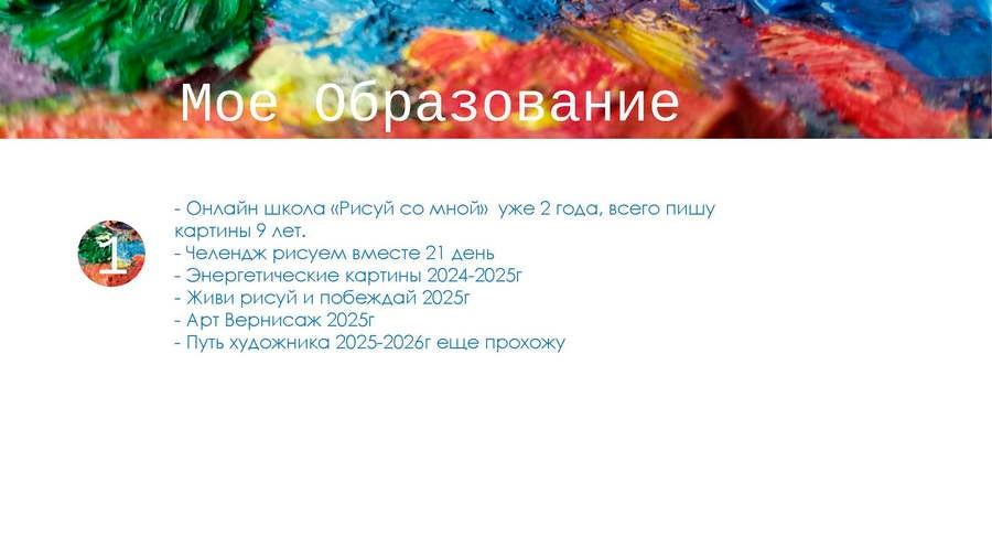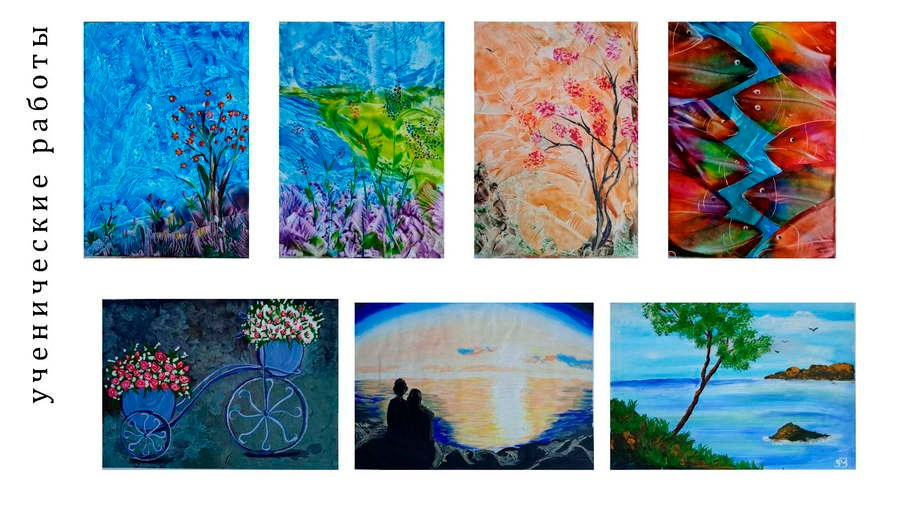 На котором изучаю различные техники написания картин, такие как авторские, живописные, энергетические, интерьерные, у-син, сухая кисть, пуантилизм, энкаустика, жидкое масло, поп-арт, холодный и горячий батик, мазковая техника мастихином, Флю-арт.