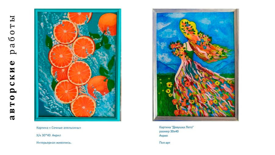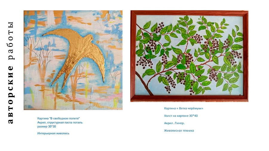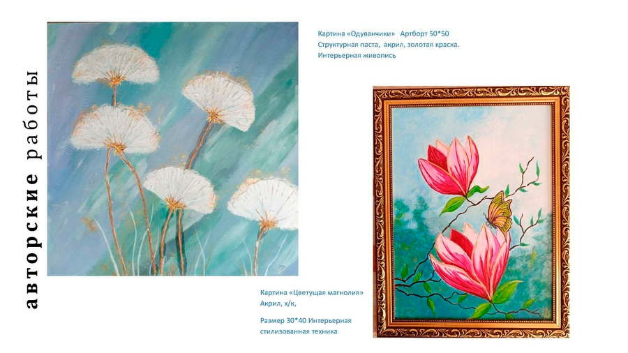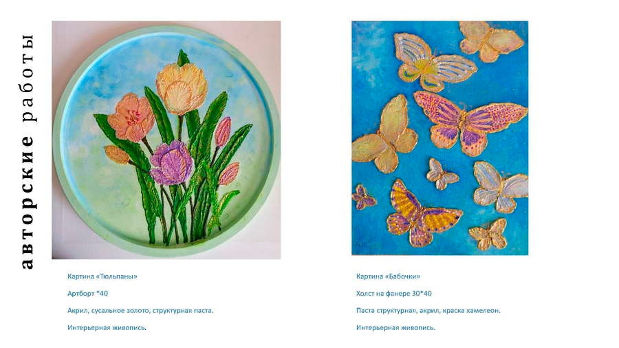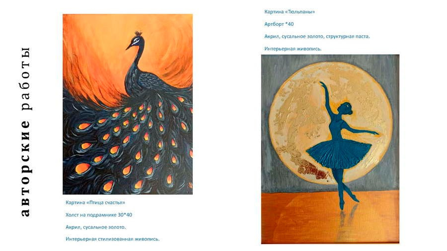 Мне нравится писать интерьерные картины акриловыми красками, так как можно экспериментировать с использованием различных материалов. Таких как: паста структурная, поталь, стразы, зеркала, блёстки, натуральные камни, ракушки.