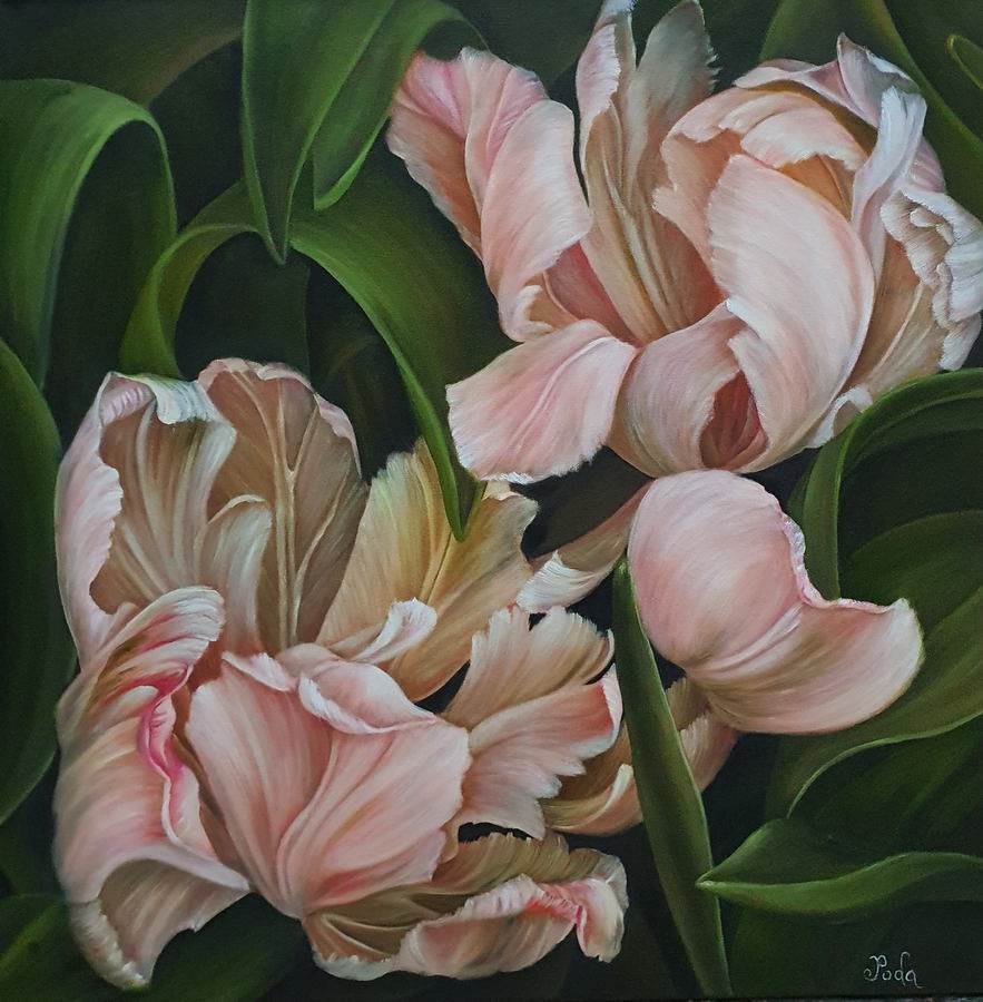 Когда я пишу картину с цветами, то прописываю каждый лепесток так — будто он единственный на свете. Я буквально чувствую и осязаю его, и вижу, как он оживает на холсте. Часто листья и лепестки сами просятся проявить их, даже если изначально они там не планировались. Они буквально появляются из пустоты и небытия на свет — в жизнь, в проявленность.