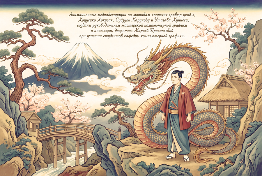 «Таро. Сын Дракона»Анимационные медиадекорации по мотивам японских гравюр укиё-э, Коцусико Хокусая, Судзуки Харунобу и Утагава Куниёси, созданы руководителем мастерской компьютерной графики и анимации, доцентом Марией Прокопьевой при участии студентов кафедры компьютерной графики.