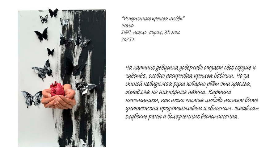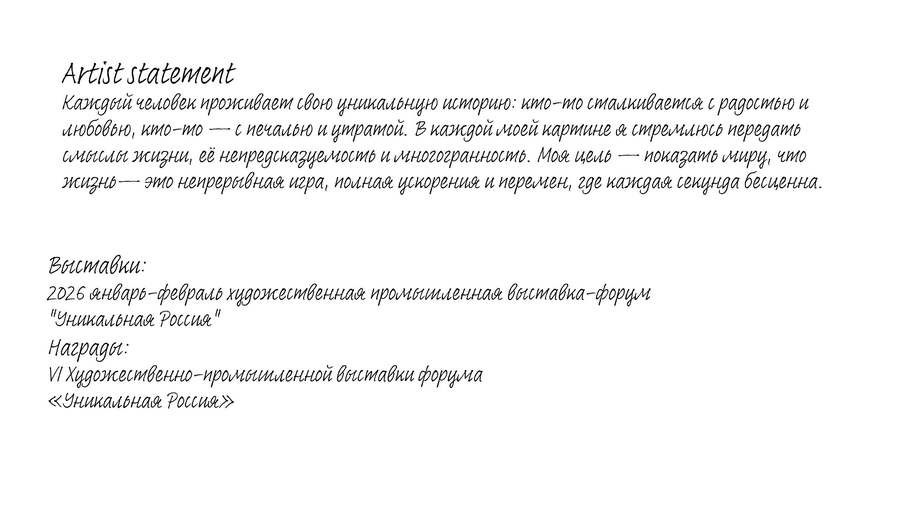 Глядя на ваши произведения, я погружаюсь в ваши чувства и мысли, начинаю задумываться о вещах, на которые раньше не обращал внимания. Ваши работы вдохновляют, трогают душу и дарят ощущение живой связи с прекрасным.