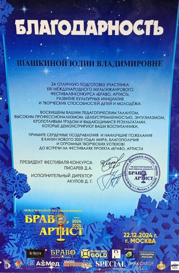 Имею благодарность от благотворительного фонда «Ковчег», от мультижанрового фестиваля -конкурса «Браво, артист», от фестиваля «Кубок России» и «Талантливая планета», от Российского культурного центра в Пекине, от президента «Art Cave GmbH» основателя Stage Art Space г. Цюрих Екатерины Рубцовой, от фонда «Московское долголетие», от ассоциации «Парки Москвы» за организацию и проведение серии выставок посвященным любви к Родине и семейным традициям в том числе на уличных стендах парка Митино, Джамгаровский, Бабушкинский, «Мос Природа», от Межрегиональной общественной организации мастеров народного творчества «НЕВО-СОЮЗ» за поддержку культуры и развитие современного искусства среди молодежи, от руководителя медиа холдинга и продюсерский центр «AM Production& Media Group», издателя семейства глянцевых журналов «Академия моды kids», «Художники России», журнала «Художники России», автора проектов «Ребенок — посол мира», «Арт-Академия», члена Творческого Союза Художников России, члена Международной Федерации Художников Ирины Чувараян за патриотизм и вклад в духовно-нравственное воспитание молодежи, от руководства ярмарки современного искусства «АРТ-Россия» за партнерство на детской территории фестиваля и вклад в развитие современного искусства.