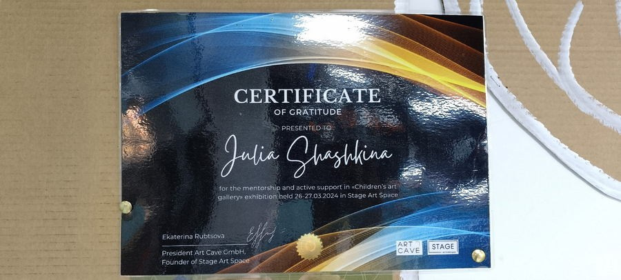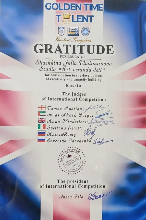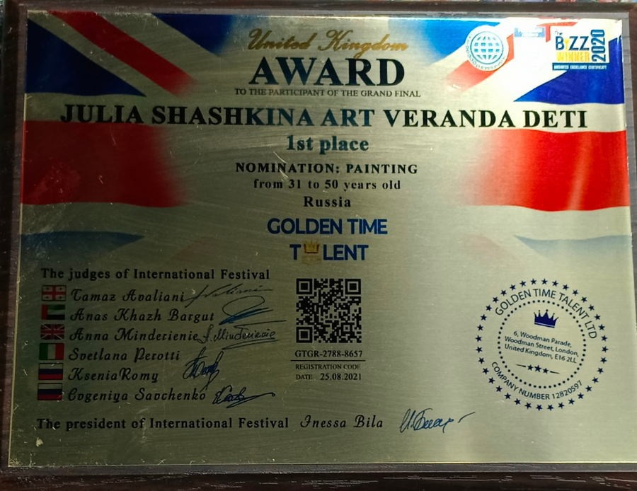 Официальный партнер детской территории «Арт-Россия», партнер «Арт-патруль. Дети». Имею наградную медаль «Наставник в творчестве» от Ассоциации Деятелей Детского Творчества.