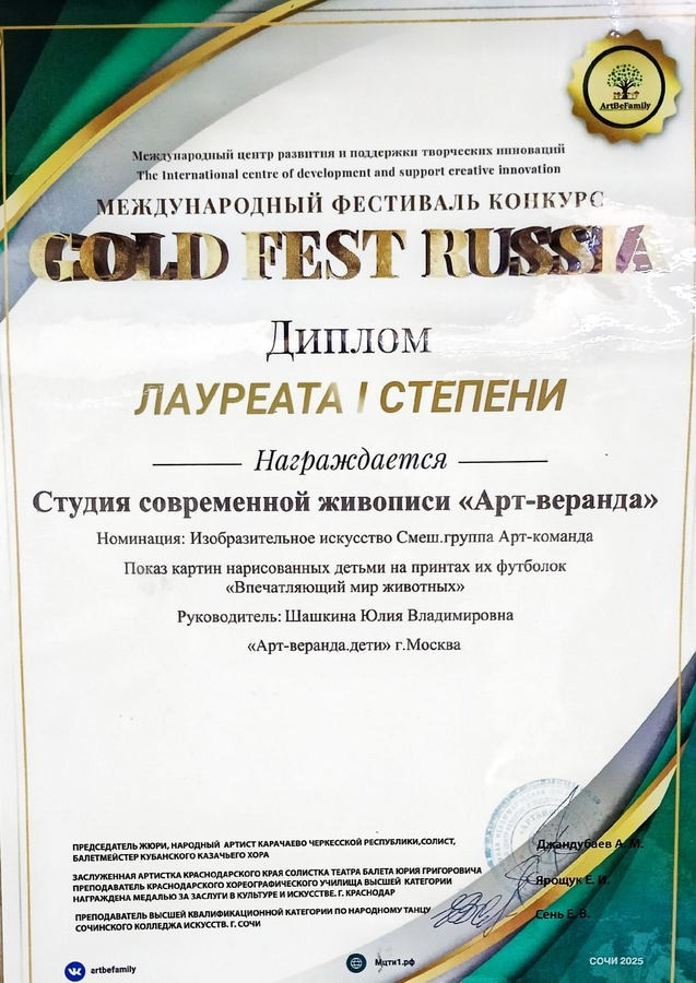 Шашкина Юлия Владимировна — руководитель студии современной живописи «Арт-веранда», руководитель творческой команды «Арт-веранда.дети»уже 10 лет представляющей коллектив детей (6-9лет) и подростков (10 — 18 лет) художников на территории России и представляющей Россию в том числе за пределами нашей Родины в дружественных странах.