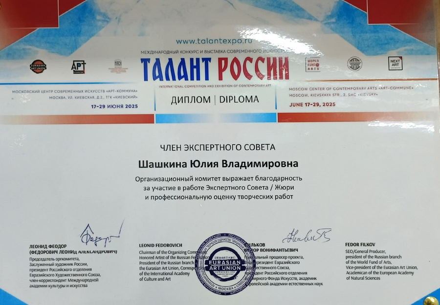 Руководитель секции «Арт-Педагогика» Евразийского Художественного Союза, Член Евразийского Художественного Союза, Член Ассоциации Деятелей Детского Творчества, Аккредитованный амбассадор-педагог международного детского-молодежного проекта «Teen Art Awards», куратор детской территории фестиваля современного искусства «Море внутри».