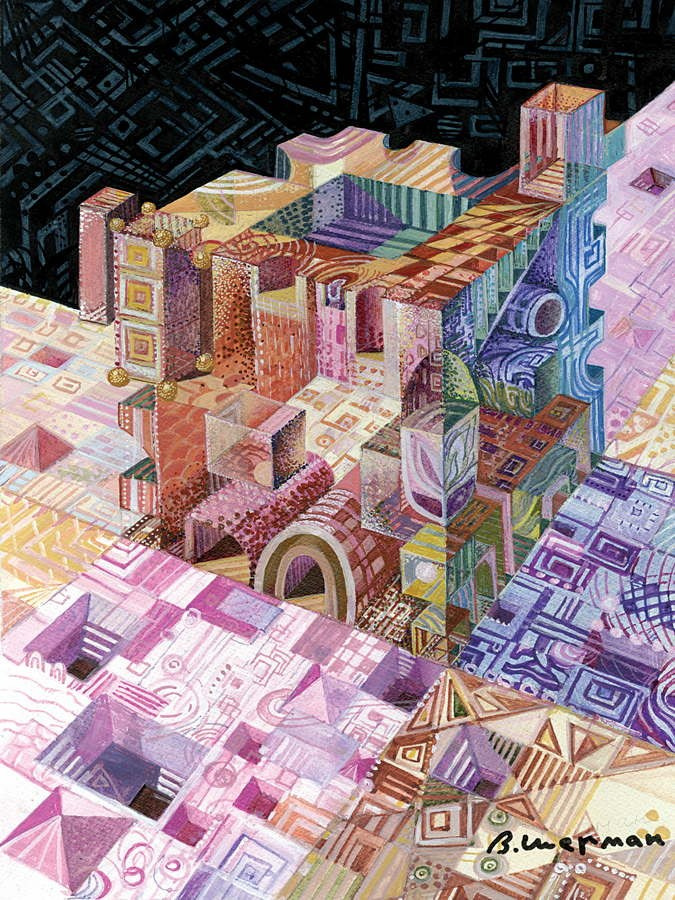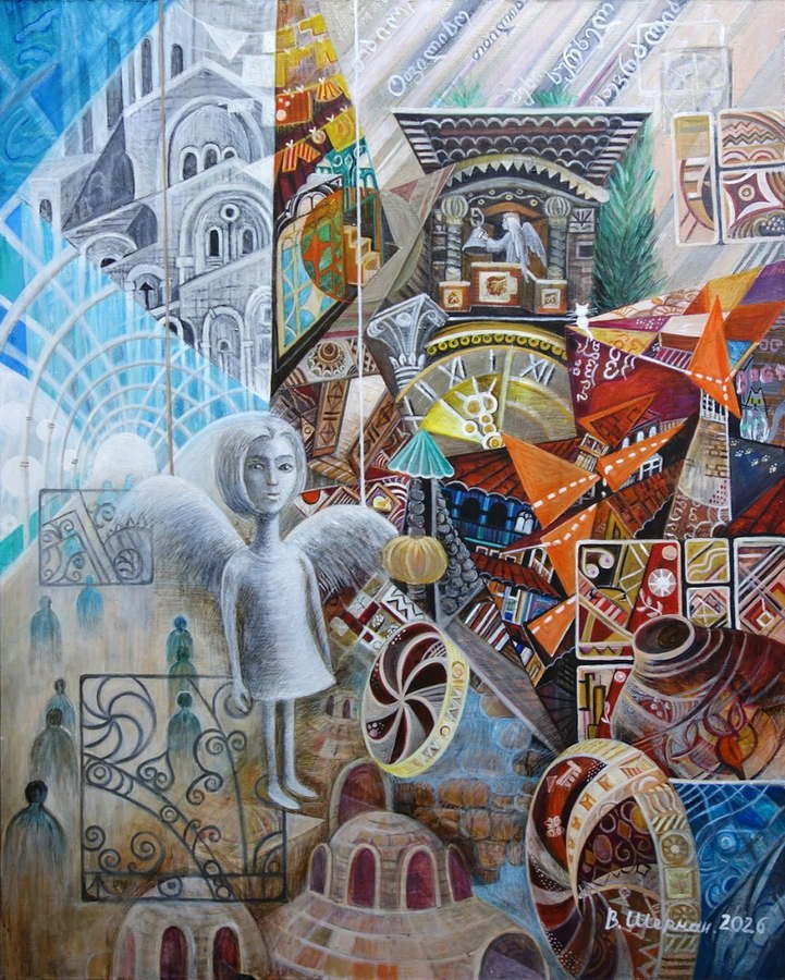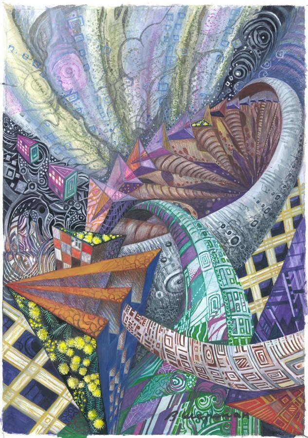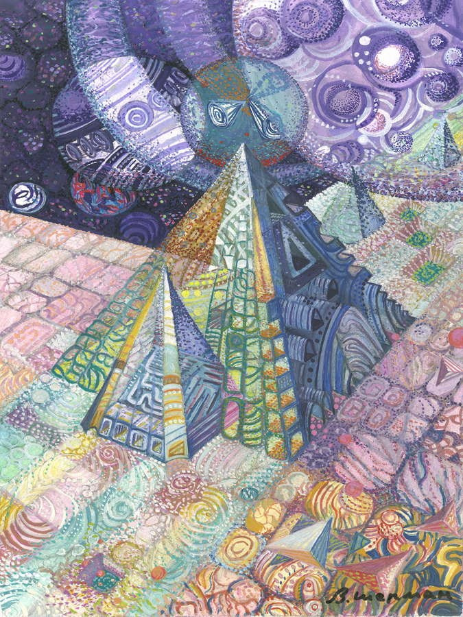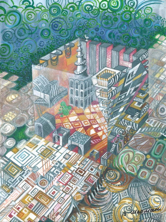 Так родились мои первые работы, где узор проникал повсюду: в любимые стереометрические формы, в фигуры людей, небо, дома.